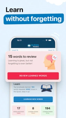 Quran Progress가 특별한 이유는 바로 '스마트 학습' 접근 방식에 있습니다. 꾸란에서 가장 자주 등장하는 1500개 이상의 핵심 단어에 집중하여, 최소의 노력으로 최대의 학습 효과를 경험할 수 있습니다. 개인 가상 코치가 학습 여정을 안내하며, 자동 생성되는 복습 계획은 암기에 대한 부담을 덜어줍니다. 또한, '간격 반복' 학습법을 통해 한 번 배운 내용을 오랫동안 기억하도록 돕습니다. 퀴즈, 객관식 문제, 쓰기 및 추측 게임 등 다채로운 활동으로 아랍어 학습을 더욱 즐겁고 효과적인 경험으로 만들어 드립니다. 보너스로, Medina Book 1권과 2권의 모든 어휘도 Quran Progress 안에서 만나볼 수 있습니다.