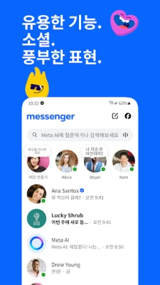 Messenger는 무료 메시징 앱으로, 가족 및 친구들과 편리하게 연결해줍니다. 관심사를 공유하는 사람들과 소통하고 커뮤니티를 만들며, 다양한 방식으로 자신을 표현해 보세요. 어디서든 원하는 사람과 자유롭게 대화하세요.